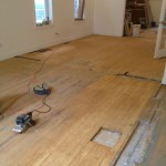 No work last weekend, since I was suffering with back issues. Today, I went for a run and then back to the house to work on the floor. The dining room is basically done, at least with paint/finish removal. Now I’m working on the living room. Here’s how it looked about halfway through.