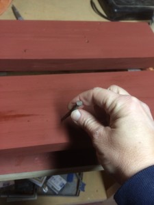 Before I even think about going back to work tomorrow, I decided to try to do something fun in my basement. My project is to make something to hang coats by my door. I have a couple of boards that I made out of lathe that are around 6″ wide and maybe 30″ long. I sanded them down and painted them red with milk paint. Once they dry, I’m going to pound in some of the original nails to use as hooks. Then I’ll hang one of the boards on the wall by the door. I haven’t yet decided if I’ll hang them both. I think I’ll see if I like the one by itself first to see if I like how it looks. And how the nails work as hooks.