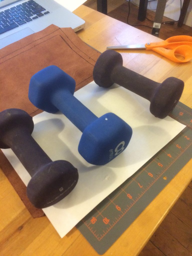 Since the leather was sort of thick, I tried putting my weights on the edge to hold it down.