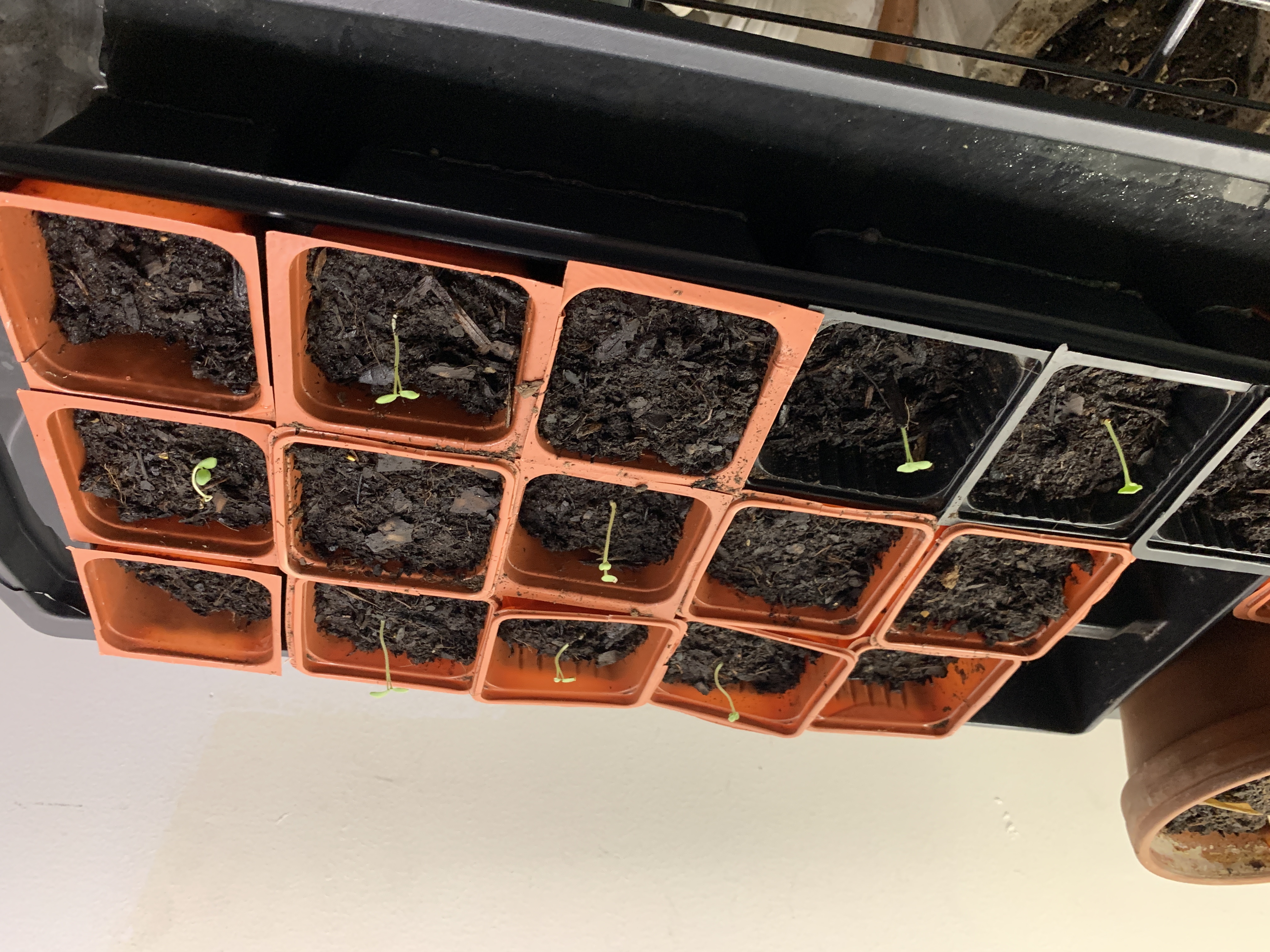 I started them on January 2nd and put them on two heat mats that I had purchased a few months ago. I was told that they take a long time to sprout, so I waited. On January 29th, I still had no sprouts and I realized that I was doing something wrong. My guess is that I wasn’t keeping the soil moist enough. I bought some trays like you’d put by the door for boots in the winter, simply because that was easily available. I put the two trays of seeds on those trays and kept them filled with water, which got pulled up into the containers where I planted the seeds. I then covered the trays with saran wrap to try to keep everything moist. On the same trip where I bought the boot trays, I also bought an actual seed starting kit and put the seeds that I had left in that, along with some other flower seeds I had lying around. That did it. The seeds sprouted by February 2nd.