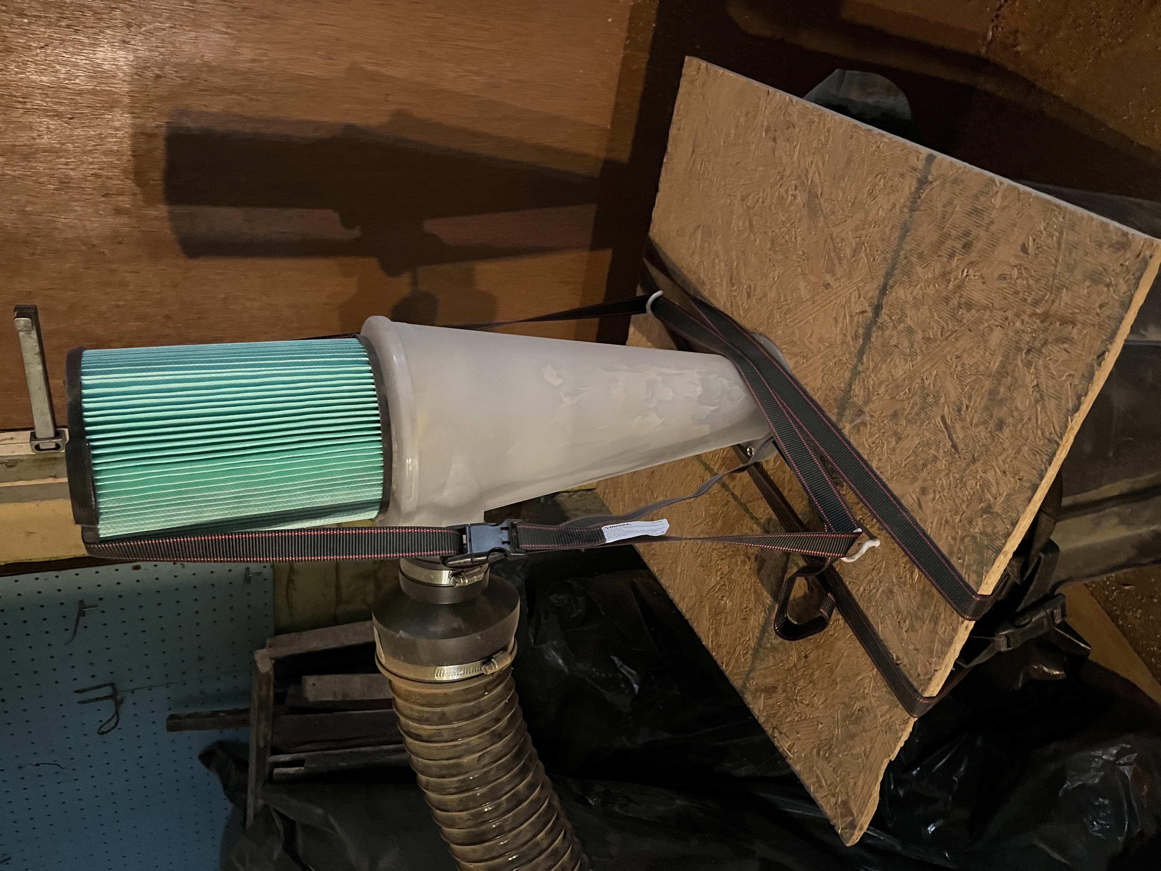 We’ve been using the planer quite a bit. The one we have has a powerful motor to eject the chips. They’d go everywhere if you didn’t put something on the output port. We had a very long hose that we ran outside the back door to at least blow the chips outside. But they all usually just stayed right by the door, so we’d still have to go outside and sweep them up. I wanted something to collect the chips better and I found this site. Unfortunately, the cyclone separator that I bought was a little different than the one in the post. But I managed to make it work by simply screwing it to a piece of plywood that I had around. Then I just used tie downs to attach it to a garbage can. The tie downs are easy to take off, so it should be easy to change the bag when it gets full.
